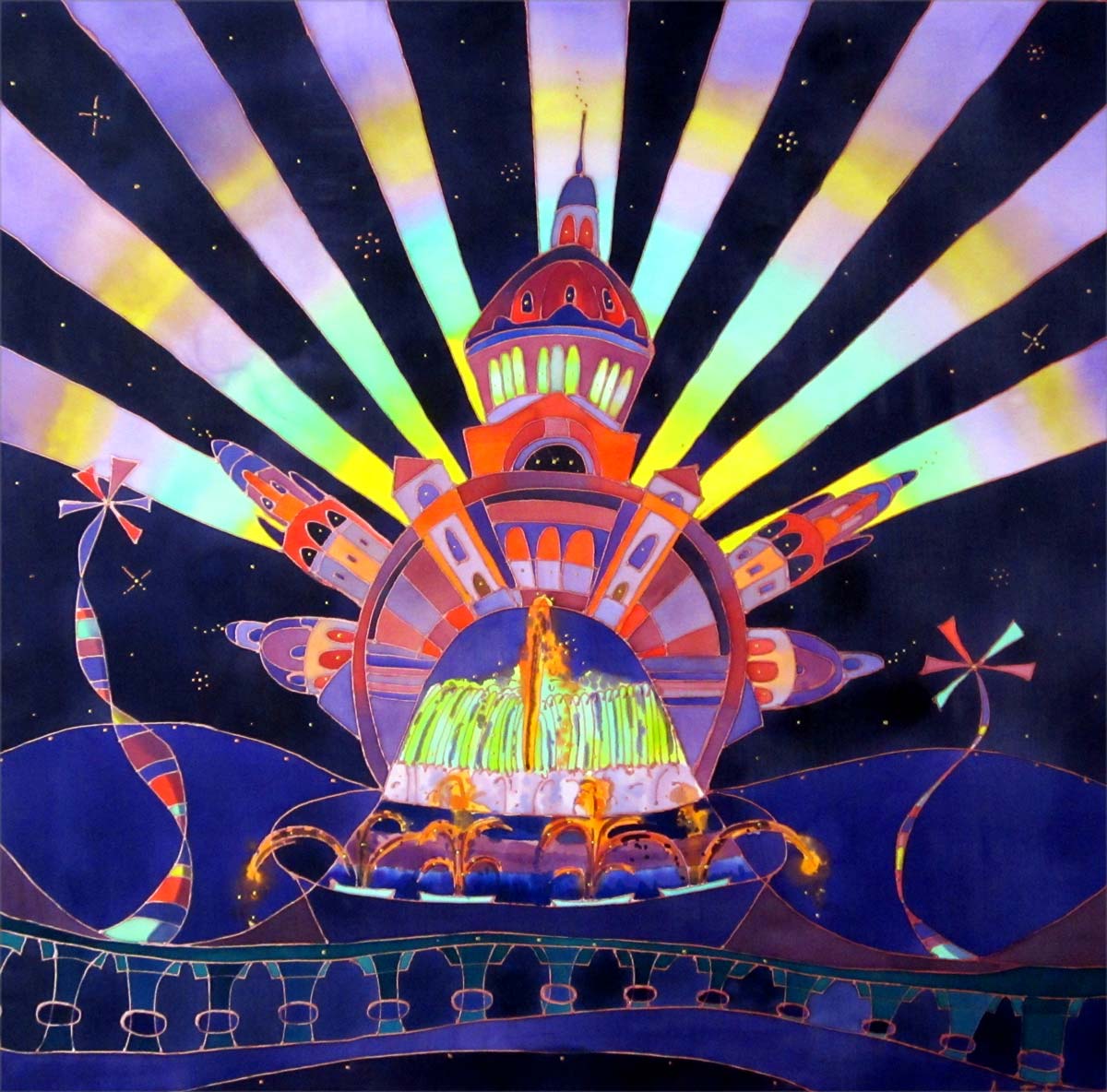 These sources are part of my childhood memories. The silk support helps me transmit the explosion of color, light and water from a prism of marvelous spectacle.